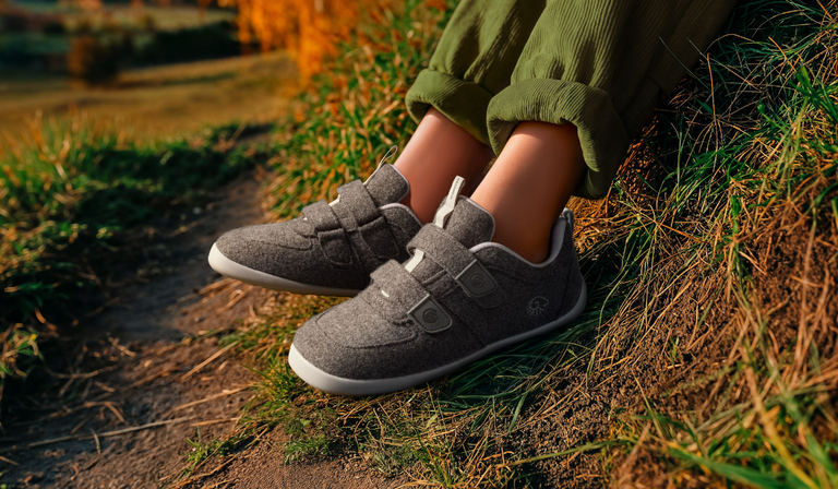 Dünne, flexible Sohle für echtes Barfußgefühl, atmungsaktive Merino Wolle oder Baumwolle, praktische Klettverschlüsse und Schlaufen für einfaches An- & Ausziehen.